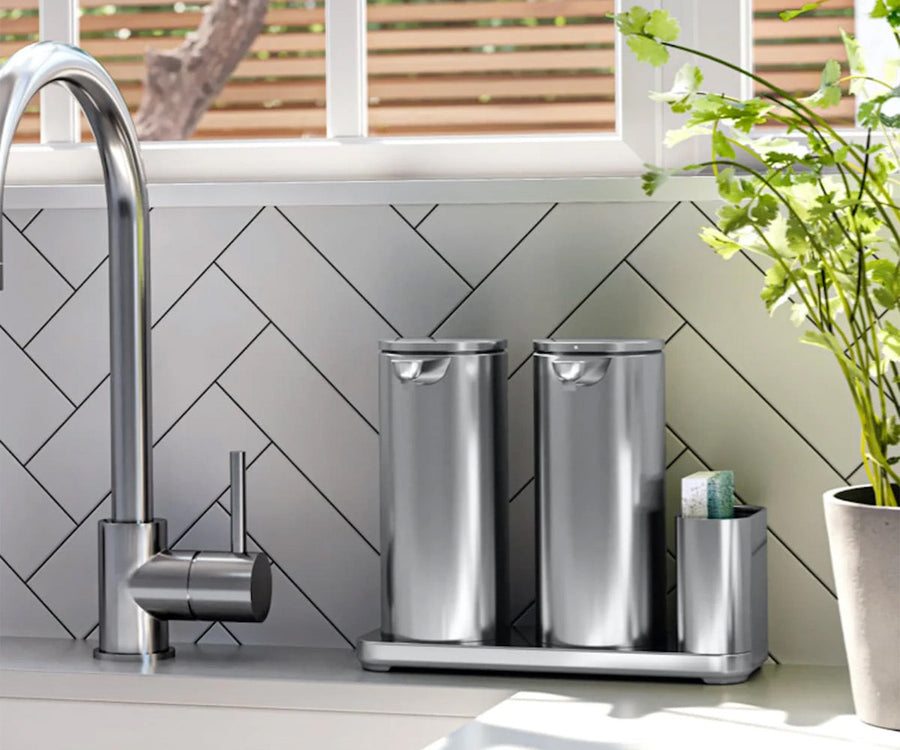 Our dual-pump sponge caddy has space for two — one pump for hand soap and one for dish soap.