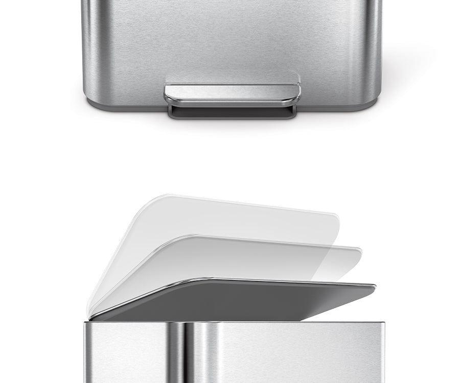 The strong pedal is engineered to last over 150,000 steps — that's more than 20 steps a day for 20 years — and our patented lid shox technology controls the motion of the lid for a slow, silent close.