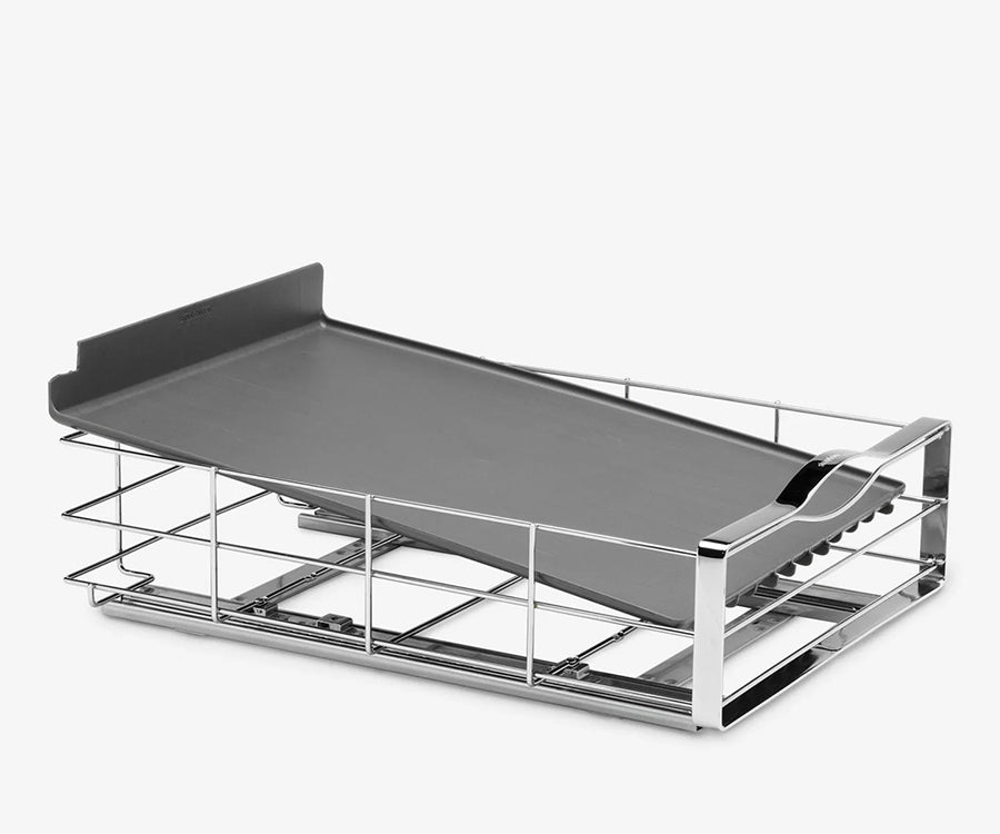 Grab the steel handle to pull the organiser out of the cabinet quickly.