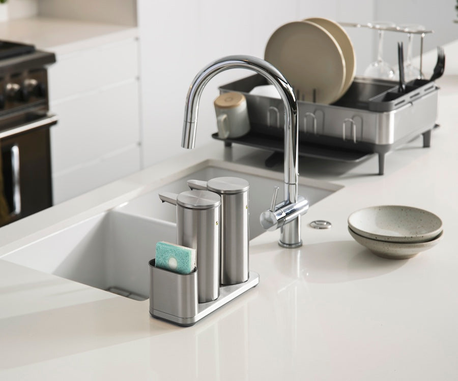 Give your pump and sponge a well-designed home with our stainless-steel sponge caddy. Keep the busy sink area clutter-free.